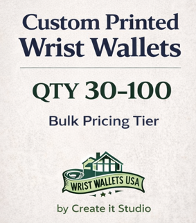 This listing is for orders of 30 wrist wallets to 100 wrist wallets which come in two (2) custom-made Wrist Wallets so you would order qty 15 to get 30 wallets, created using fabric designed exclusively for your company, organization, or special event. Your custom fabric design is developed from your logo, branding, or artwork and printed specifically for this project, making these wrist wallets a truly one-of-a-kind promotional or team accessory.